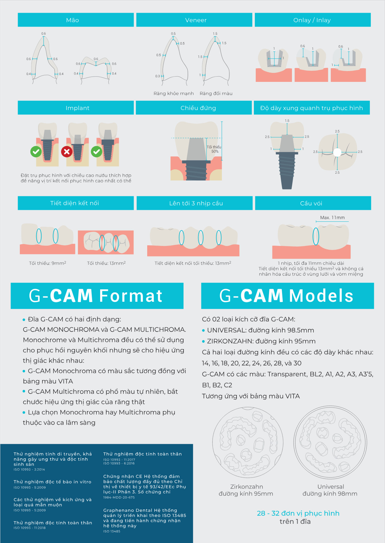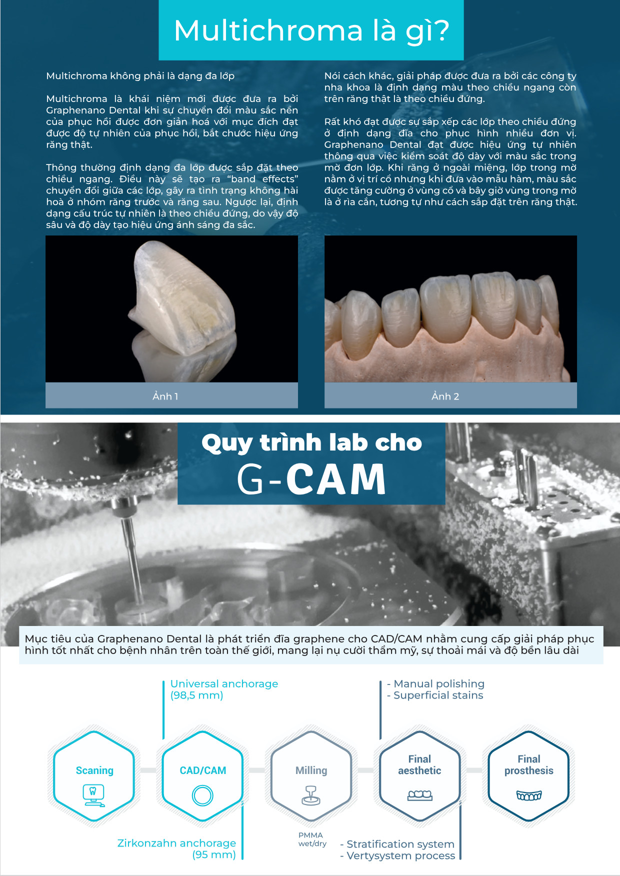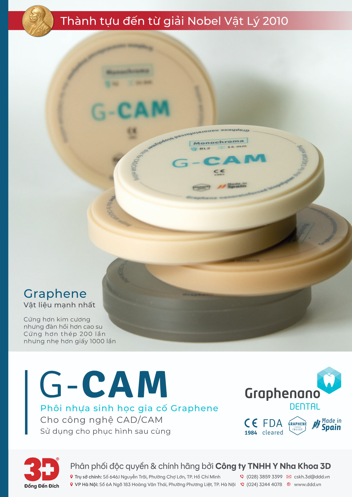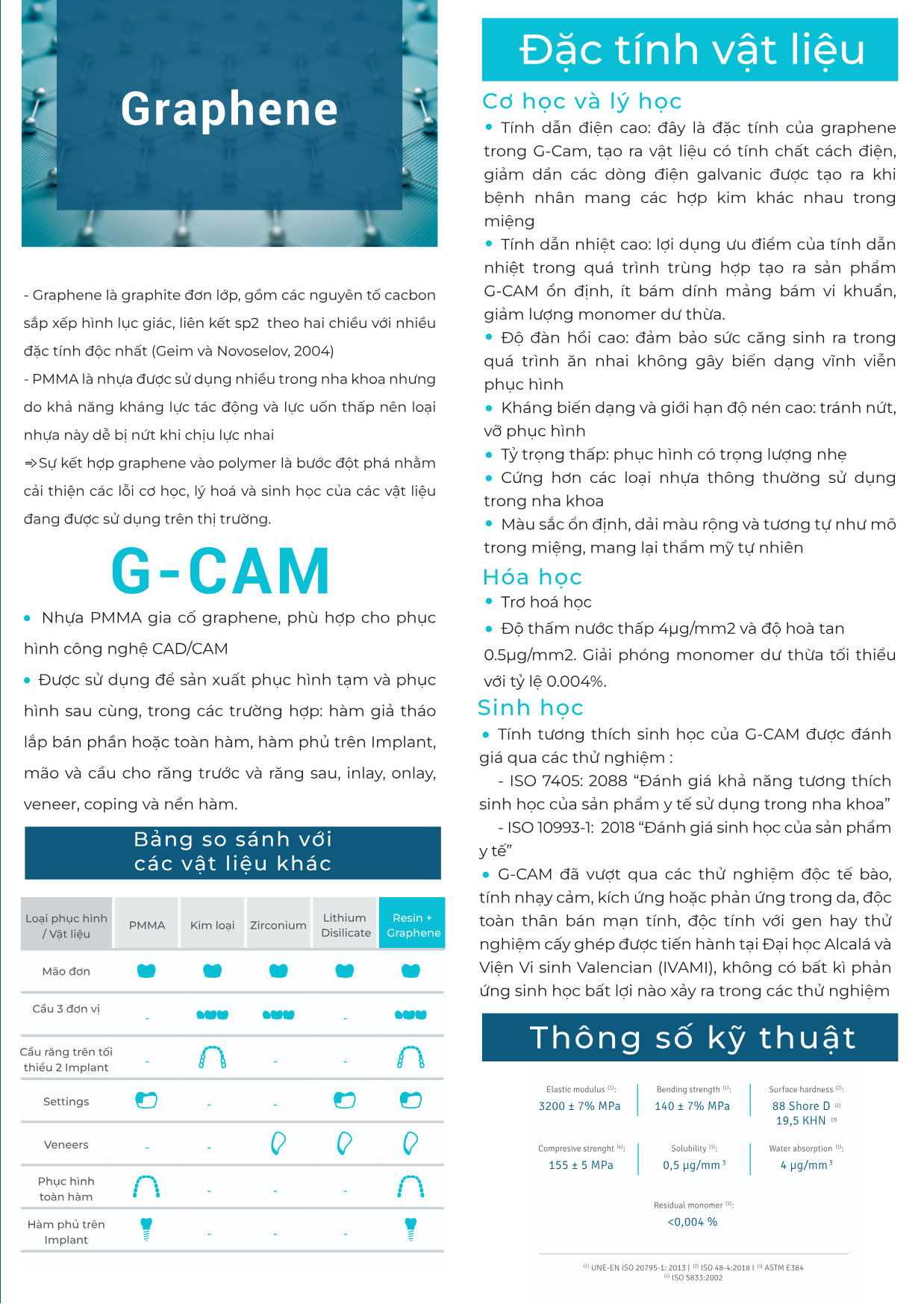 Ứng dụng của giải Nobel vật lý 2010. Phôi nhựa sinh học G-Cam gia cố Graphene với khả năng chống thấm cao, kháng mài mòn và tác động cao, đảm bảo độ bền vượt trội. Dễ gia công, mang lại thẩm mỹ tự nhiên và khả năng kháng khuẩn, an toàn cho bệnh nhân.