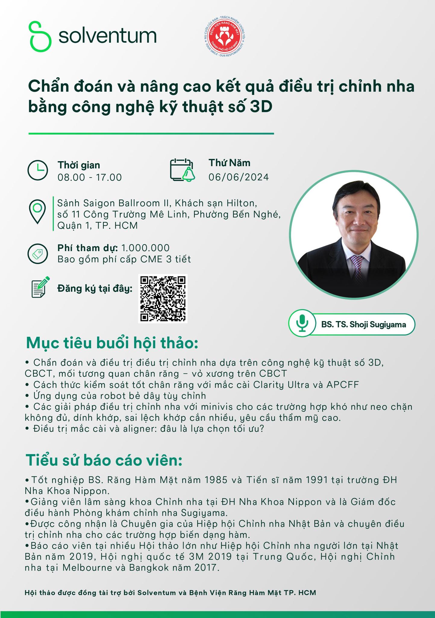 - Hội thảo được phối hợp tổ chức bởi Công ty TNHH Y Nha Khoa 3D cùng Công ty Solventum và Bệnh Viện Răng Hàm Mặt TP.HCM với sự góp mặt của Báo cáo viên là BS. TS. Shoji Sugiyama.